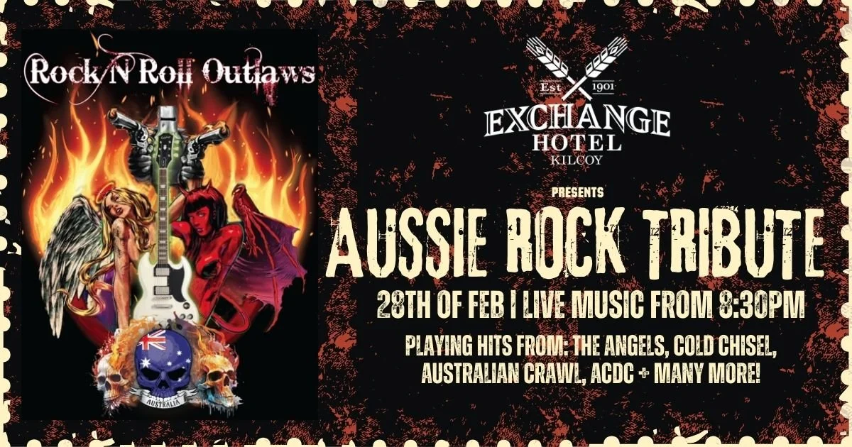 The Rock N Roll Outlaws are gracing the stage at The Exchange Hotel Kilcoy once again, bringing a night of classic Aussie rock the way it should be — loud, raw and full of hits.