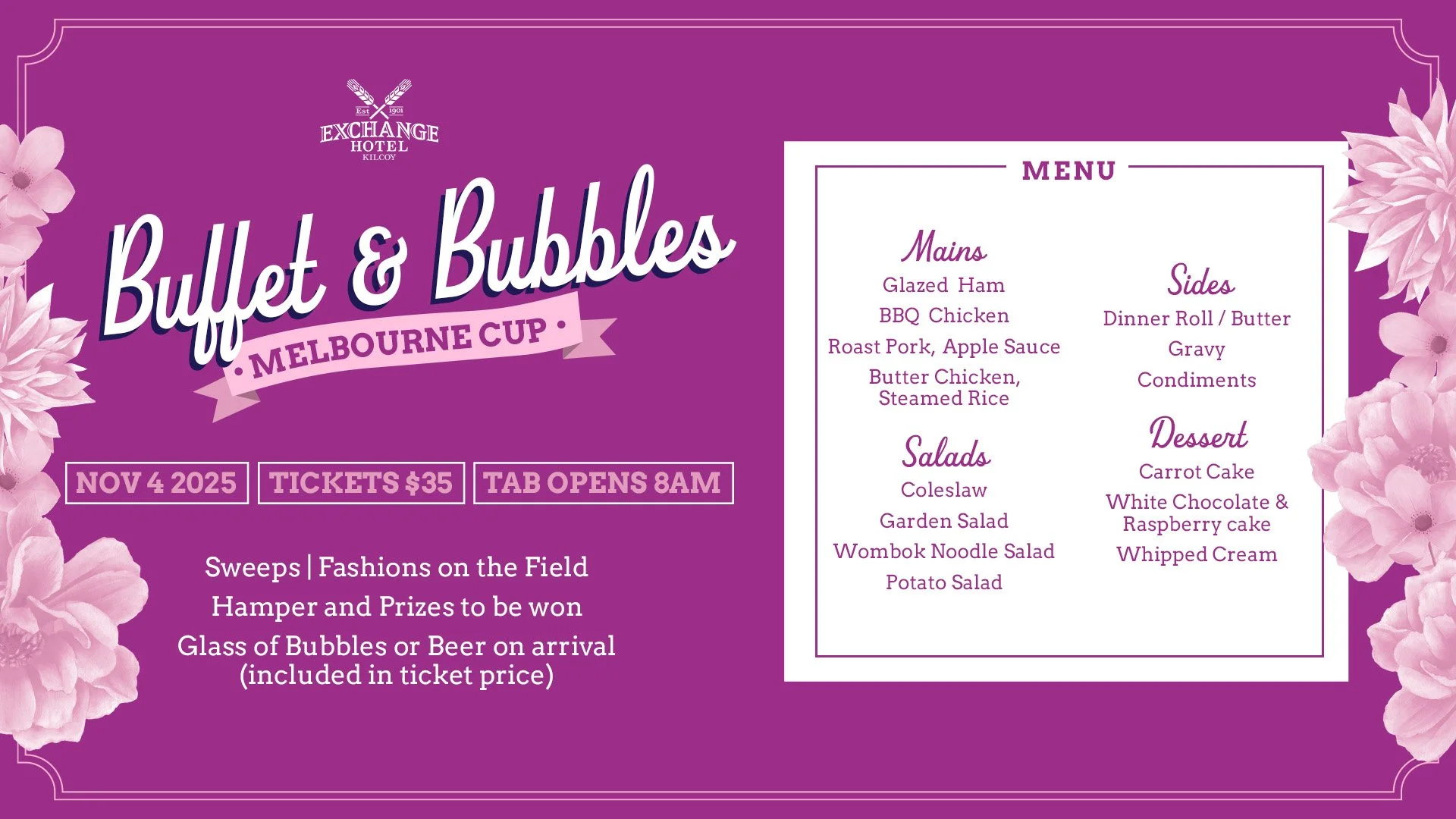 The race that stops the nation is back, and we're ready to celebrate in style! Join us at Exchange Hotel for a Buffet & Bubbles event as we toast to Melbourne Cup 2025.