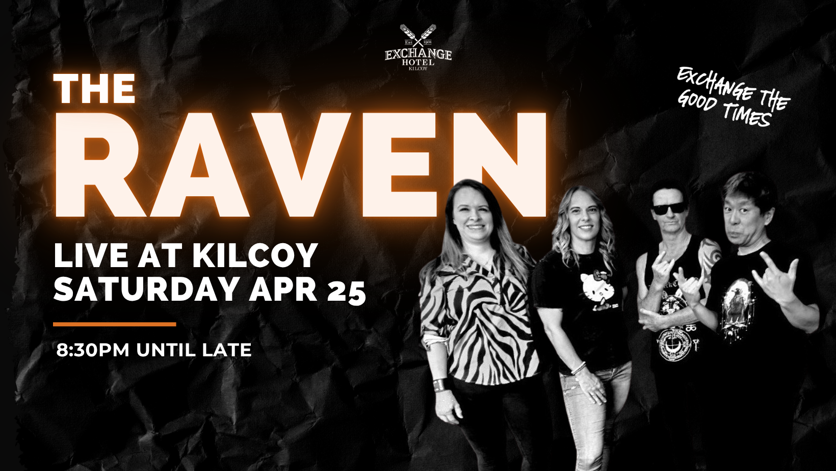 Join us on Saturday, 25th April for a live performance by The Raven, delivering top-tier tunes and Rock covers from 8:30-11:30pm.